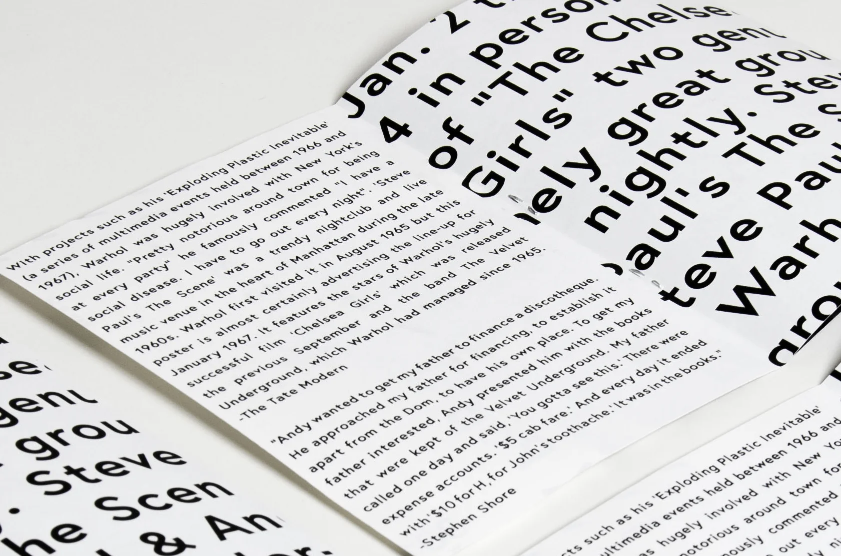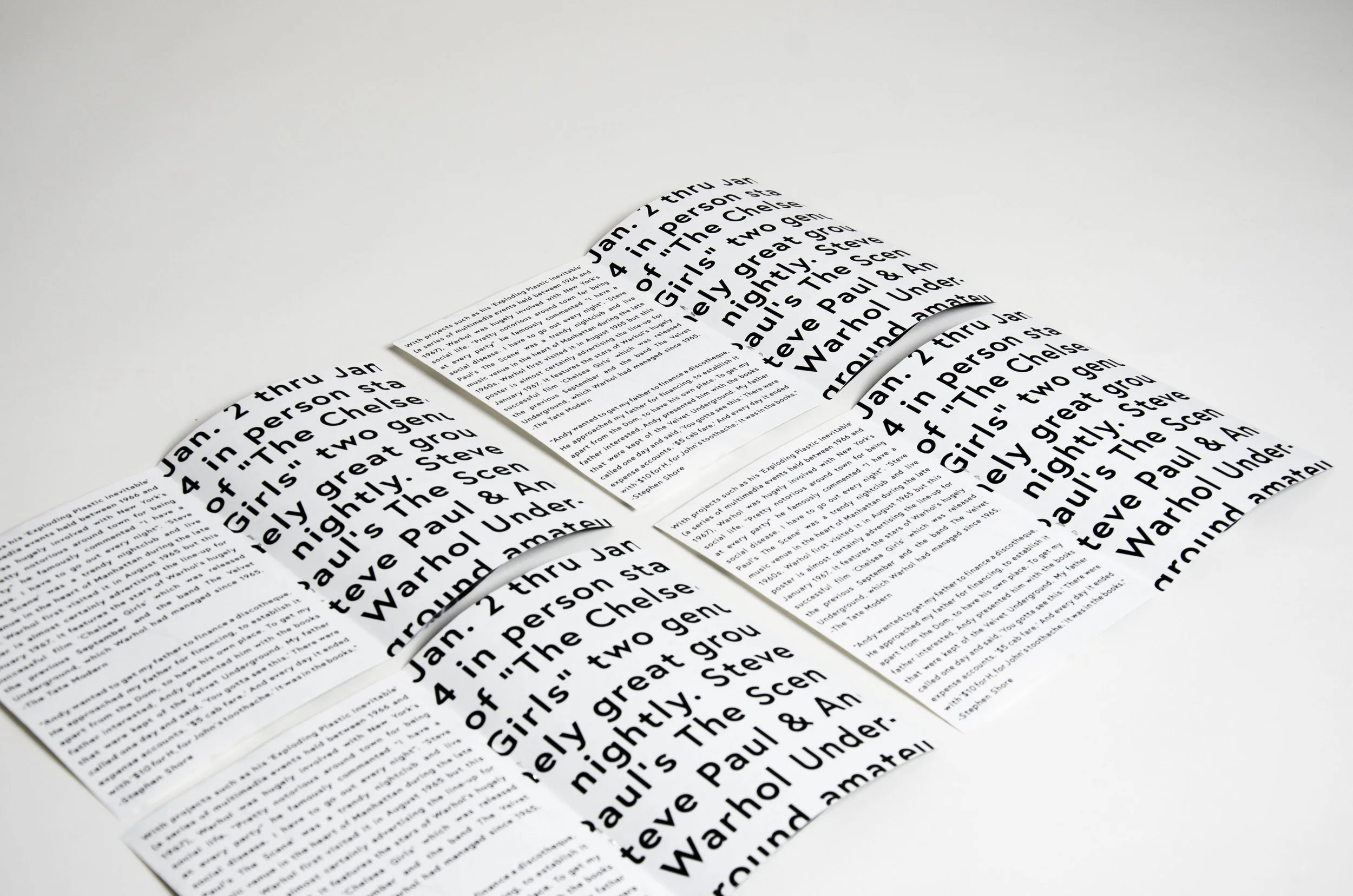 Andy is a handcrafted zine referencing Andy Warhol’s party identity. The zine’s type (front page) was taken from a poster advertising one of Warhol’s parties in 1967. A description of the poster, more text from the poster and a quote from one of Andy’s close friends can be viewed inside of the zine. The poster’s text is displayed in an abstract and almost illegible style to keep the viewers focus on the stylistic detail, over the message. The zine also includes two images from Warhol’s parties/exhibits, Mylar texture, and brown marble texture.